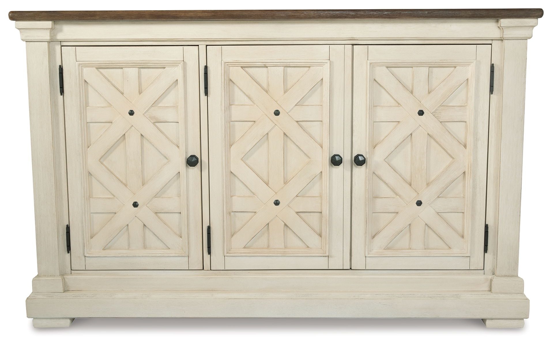Need a stylish space to store dinnerware and all your dining room essentials? This server is a dream come true with two adjustable shelves that offer large capacity and a spacious top that’s perfect for setting a buffet. Embellished with the casual appeal of three latticed doors, an attractive planked top with weathered oak finish and a lightly distressed white finish throughout, this vintage look will serve up elegance for years to come.