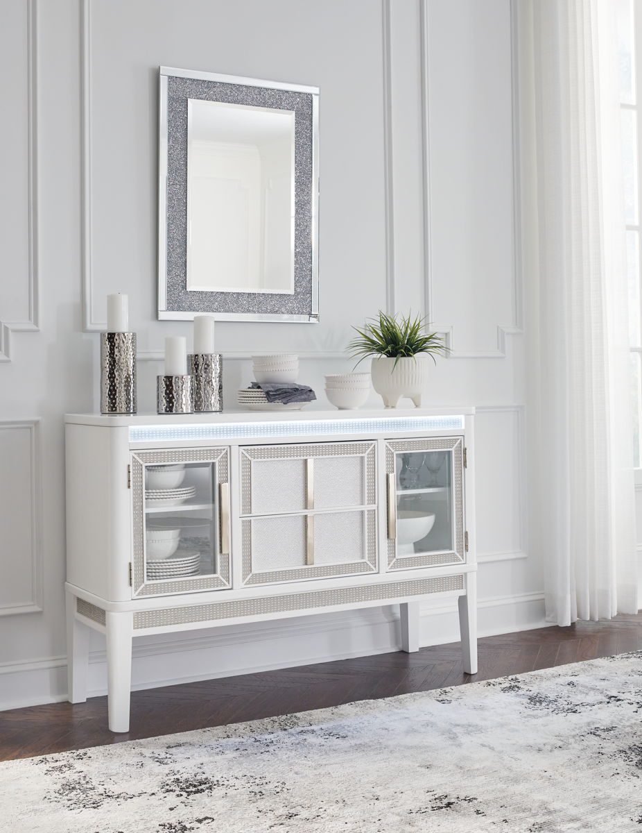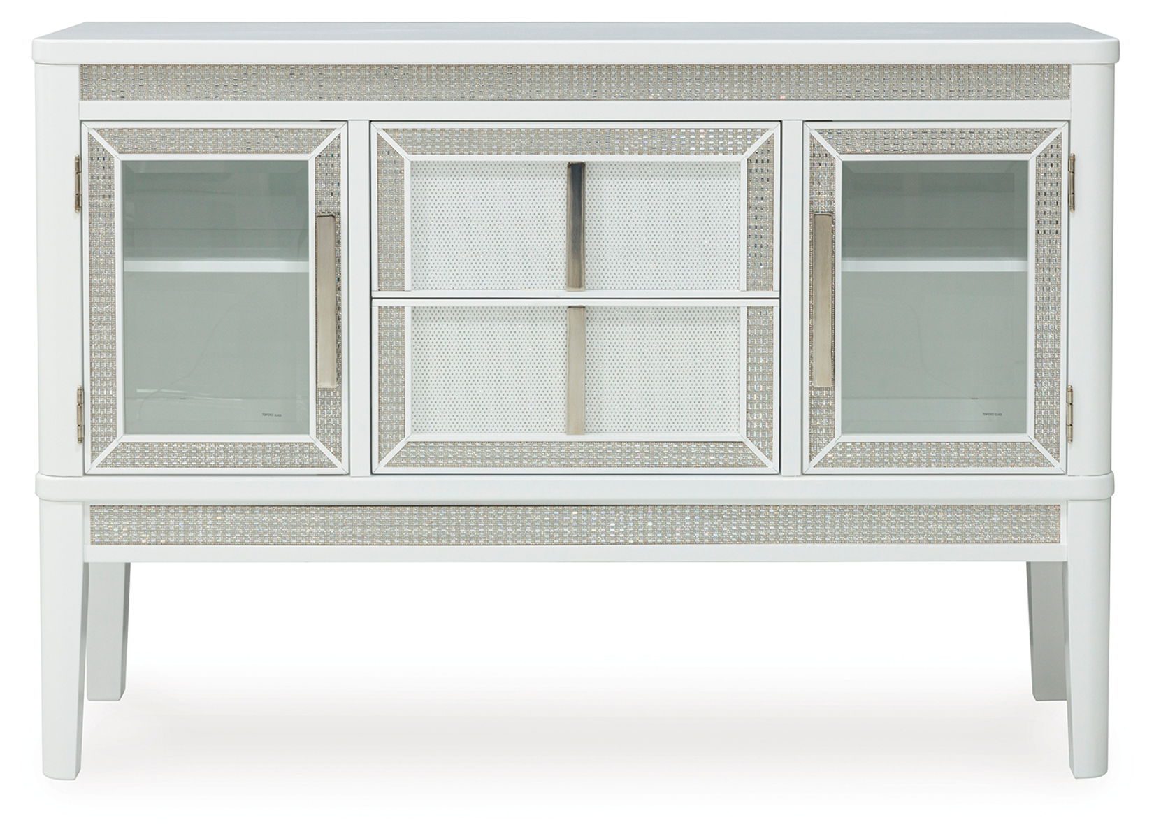 Embracing modern glamour, this server is a sparkling addition to your dining area. The bright white lacquer finish, shimmering rhinestone accents and glass panel doors give this piece plenty of polish. Discreetly placed along the upper valance, white LED lighting adds the perfect finishing touch.
