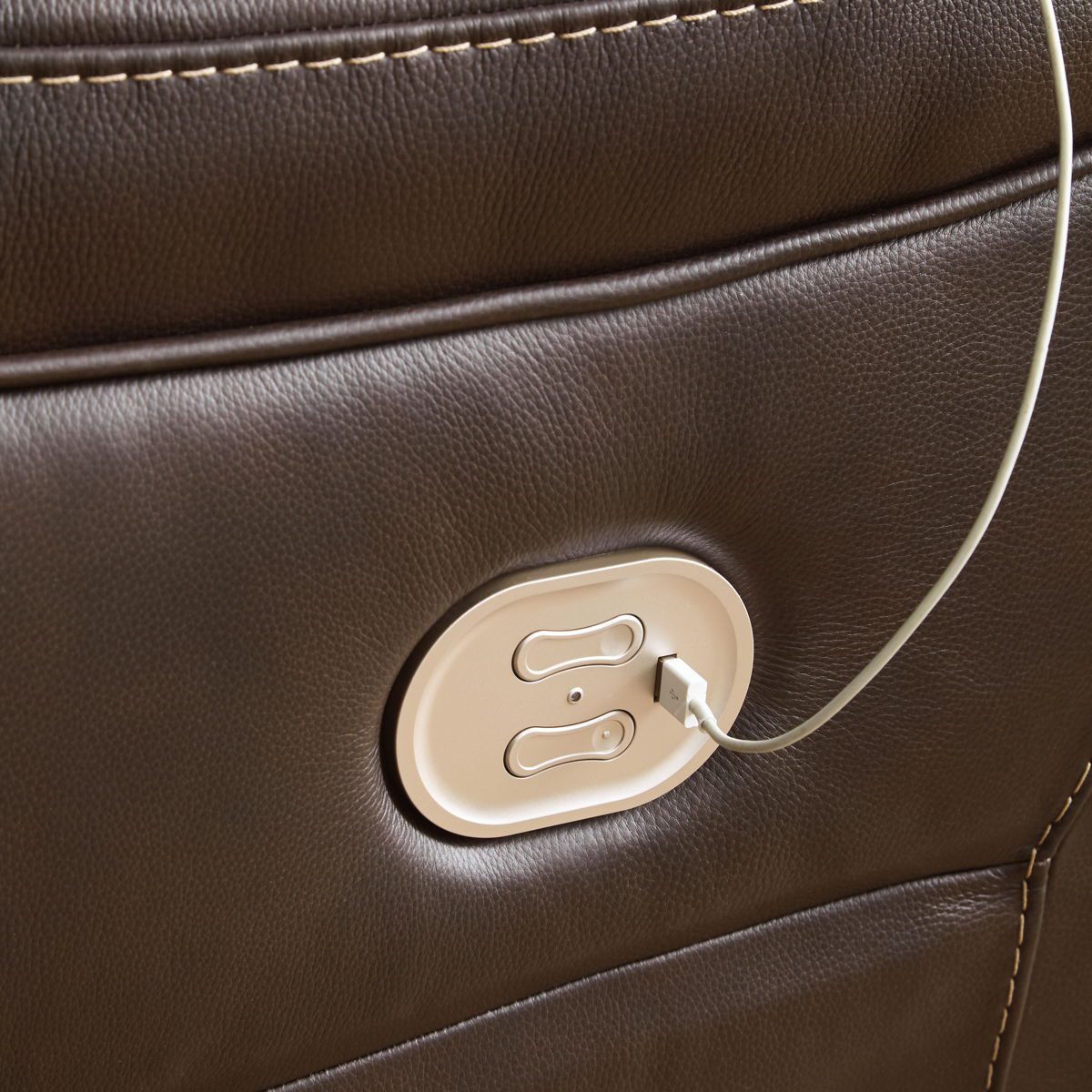 Load up on comfort in a cool, clean-lined and contemporary way with the Dunleith power reclining sectional. Rest assured, you’ll enjoy the feel of real leather everywhere your body touches (real leather interior seating/matching faux leather exterior). With a wonderfully soft hand, the heavyweight material is enriched with a pebble grain effect for authentic appeal and enhanced with jumbo stitching for dramatic contrast. It features a one-touch power control with adjustable positions and includes an Easy View™ adjustable headrest that allows a primo view of the TV even when you’re reclined. Extended ottomans provide extra length for leg comfort. A zero-draw USB plug-in at your fingertips lets you charge up as you chill out.