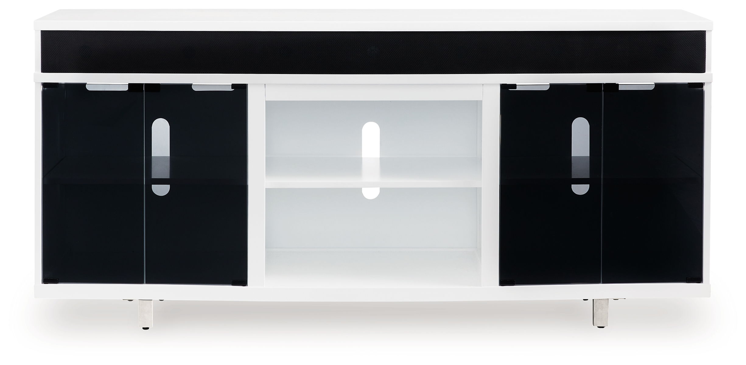 Combining a white high-gloss finish with black glass doors, this TV stand proves opposites really do attract. It’s the perfect blend of modern style and functionality, with an electric fireplace option and ample space for your media devices, flat-screen TV and soundbar. What a smart choice on so many levels.