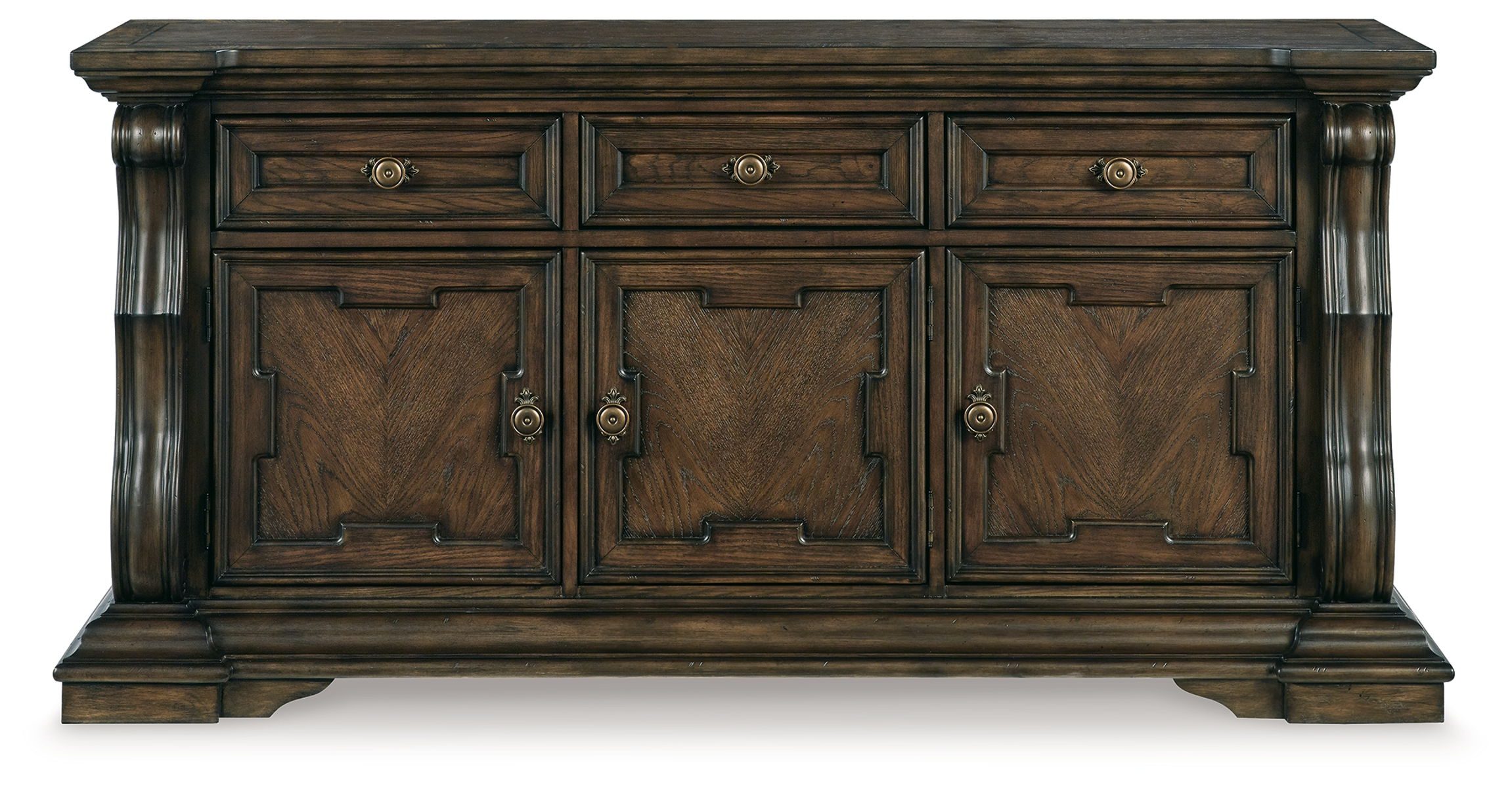 From its ornamental appliques to its large scale, this dining buffet makes a bold statement. With multiple cabinets and drawers to store necessities, the opulent piece wows with stunning style. The look is timeless. The feel? Right at home.