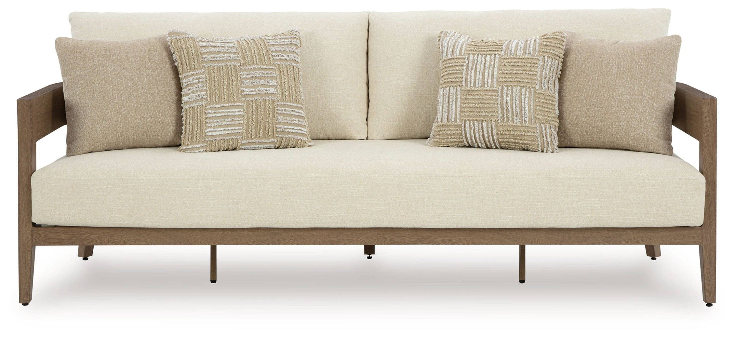 Elevate the appeal of easy-breezy living with this outdoor package. Made to look like wood yet durable enough to weather the elements, it’s sure to serve you and your besties well, year after year. The gently curved piece features cushions wrapped in Nuvella+โข high-performance fabric for plush refinement. Patterned accent pillows infuse delightful texture. The gently curved chair features cushions wrapped in Nuvella+โข high-performance fabric for plush refinement. Go ahead and take a smooth spin.